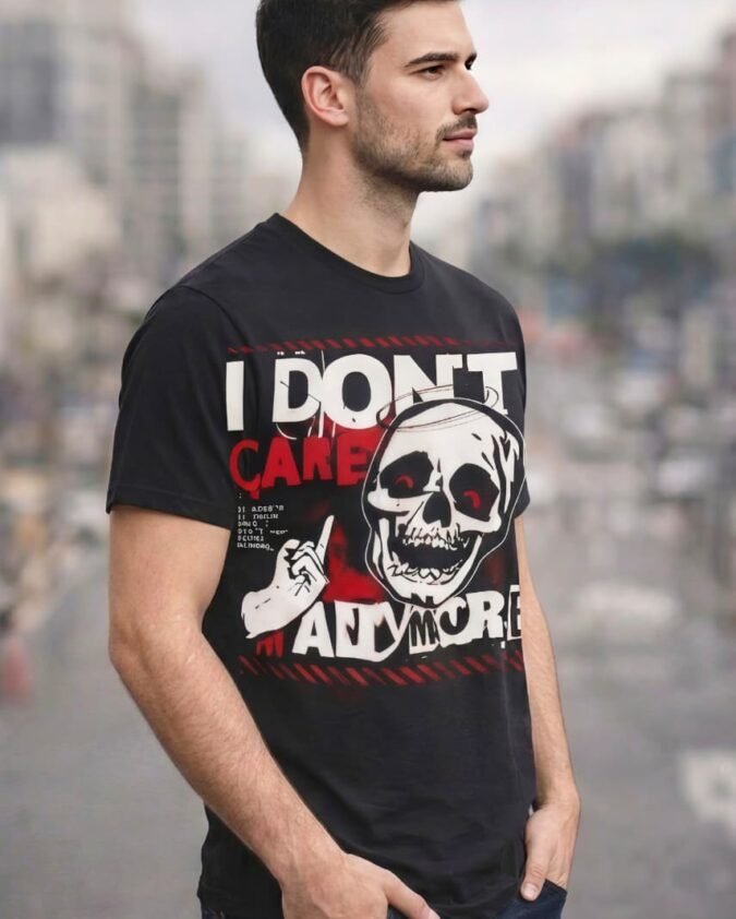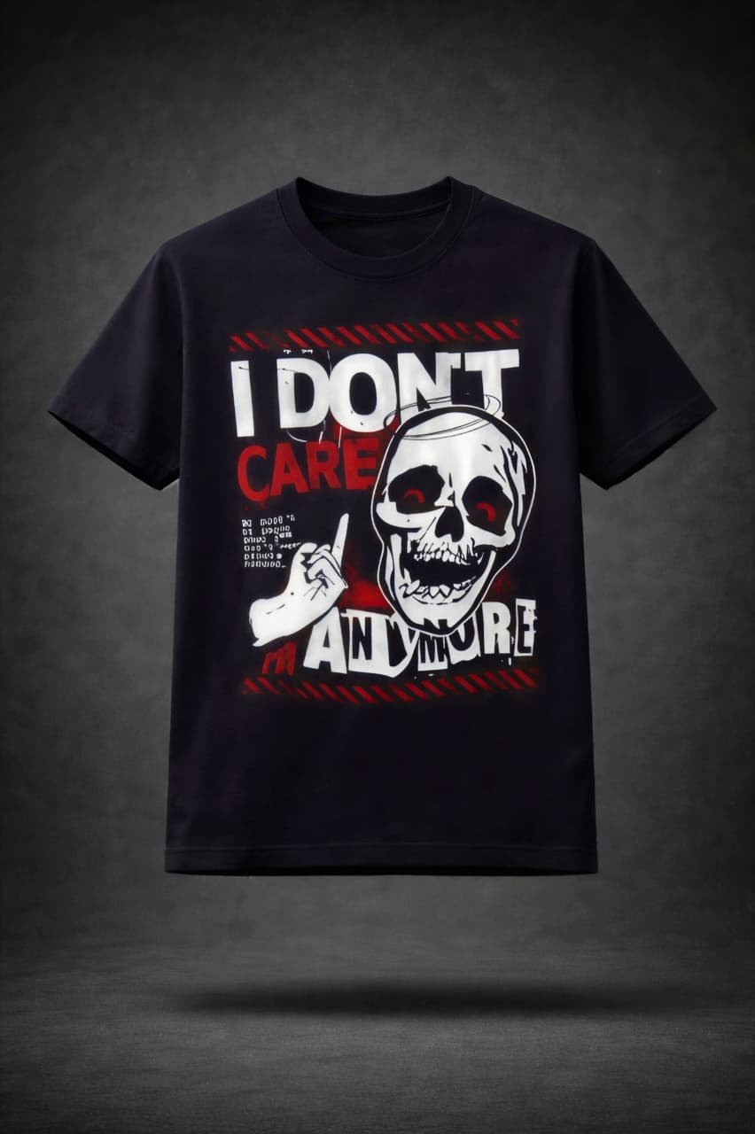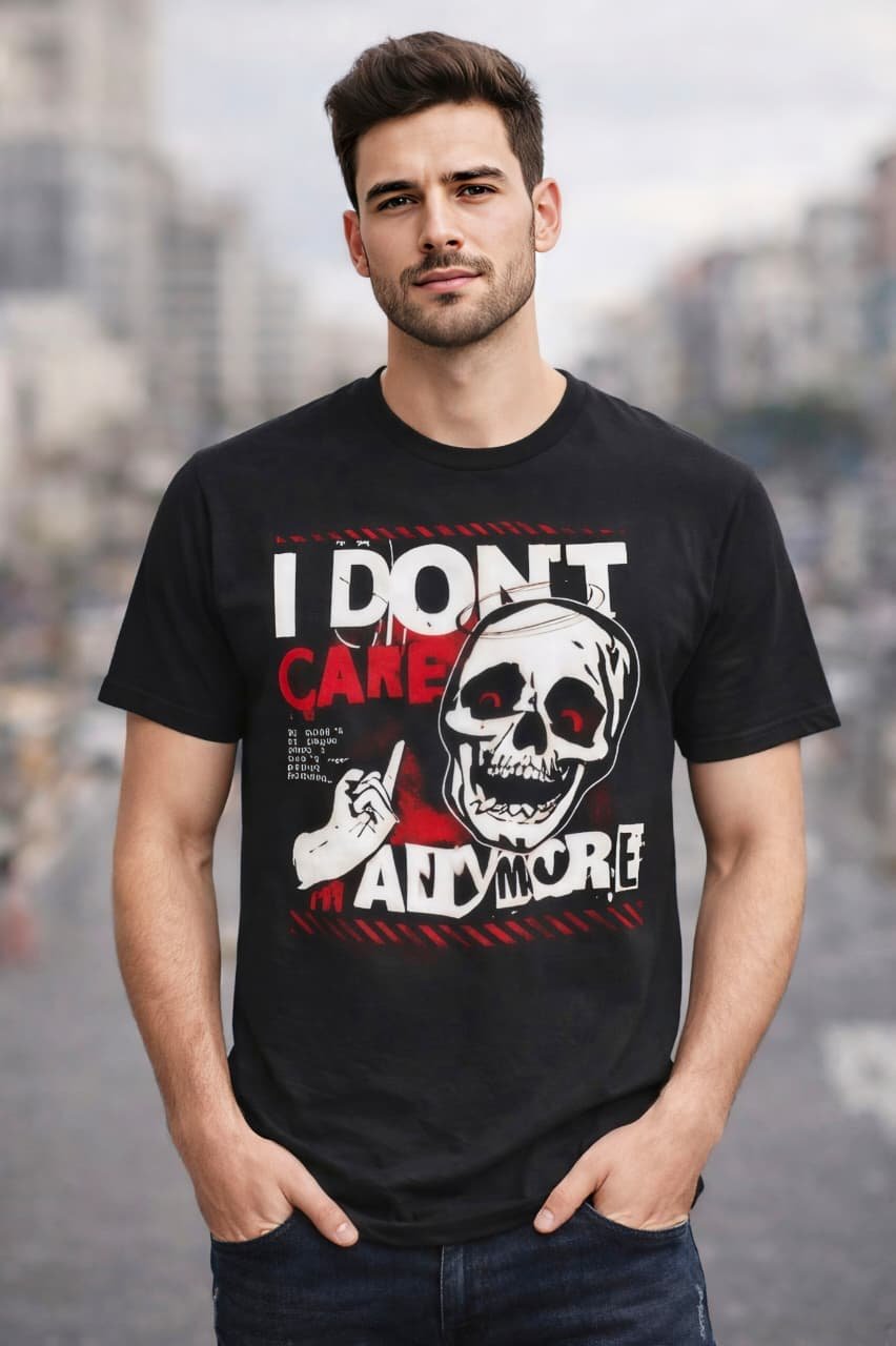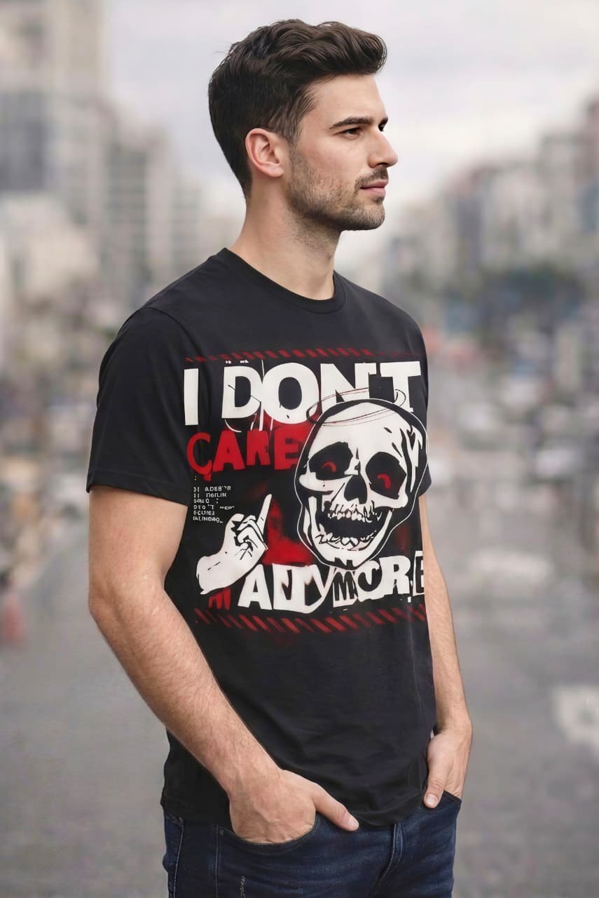 Make a fearless statement with this I Don’t Care Anymore skull graphic T-shirt, designed for those who embrace bold, attitude-driven fashion. The striking skull illustration combined with strong typography delivers an edgy look that stands out instantly.